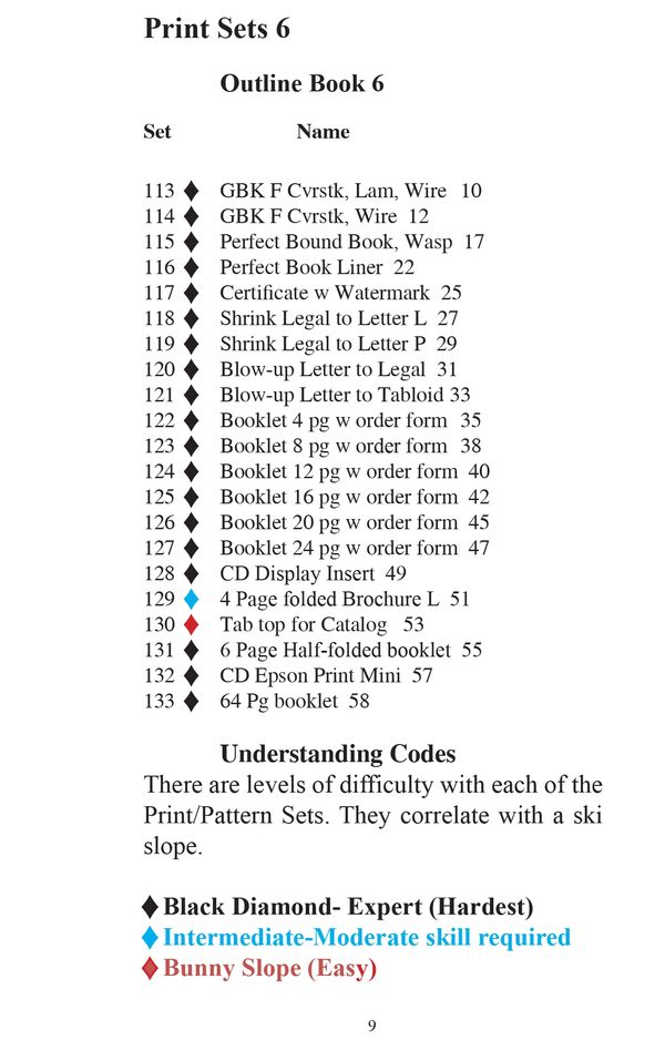 There are levels of difficulty with each of the Print/Pattern Sets. They correlate with a ski slope.